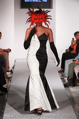 Seriously lets get back into the article and our coverage, the first look hits the Runway and oh, I guess its going to be a Masquerade Ball and this Diva is wearing a dress that we hope that the boobs stay in place and that Ms. Thing doesn’t fall on the runway. This collection seems a little young and that the maturity level of the collection isn’t really there yet, I’m seeing a lot of little fractures such as the fit and look of the collection is somewhat of a mistake you’d see in maybe a Designer that is showing for the first time. I like the possible direction and feeling of the collection but, I think I need you all to give your opinion to us and let us know what you feel about this Designer Maxwell Williams HS: